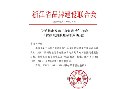【喜訊】我們公司研發(fā)的OPR-128S高速軟抽紙包裝機獲得“浙江制造品字標”認證